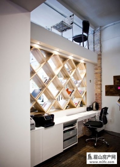 一个一个的菱形小方格构成了放置书本的小书架,同时还是一个不错的隔断,下方的